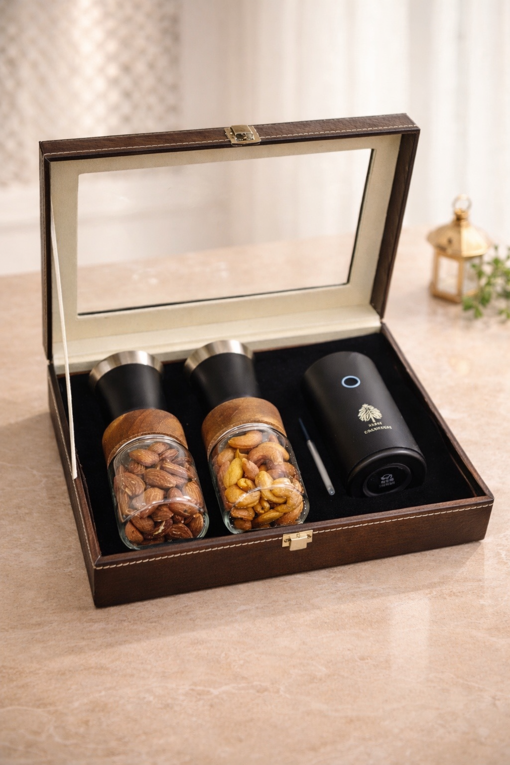 150.00 د.إA premium Ramadan gift box featuring two elegant glass jars filled with almonds and cashews, paired with a decorative candle. Beautifully packed for Ramadan, Eid, and corporate gifting in the UAE.