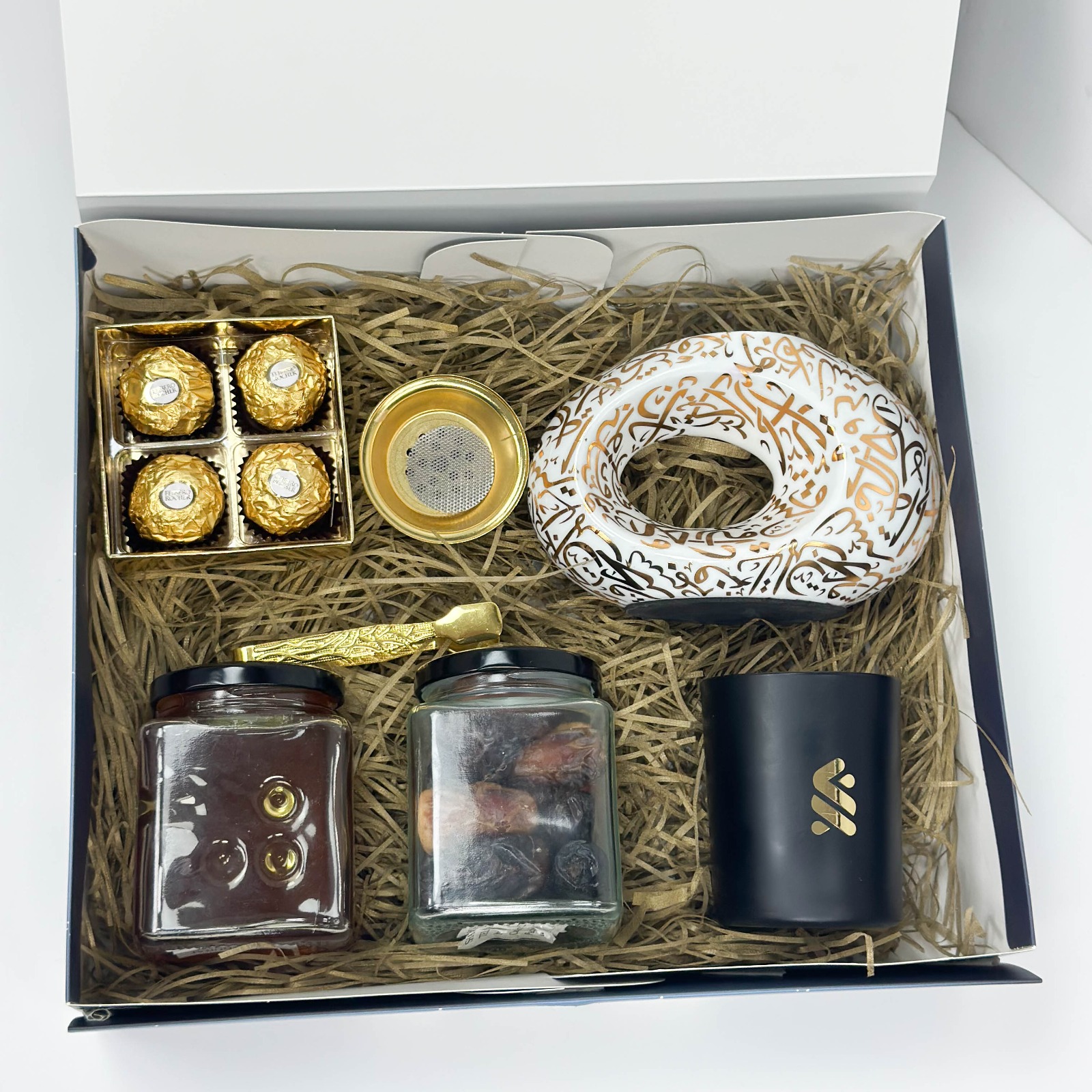 140.00 د.إA premium Ramadan corporate gift box featuring Ferrero Rocher chocolates, dates, honey, candle stand, bukhoor burner, and golden tongs. Ideal for UAE corporate gifting during Ramadan.